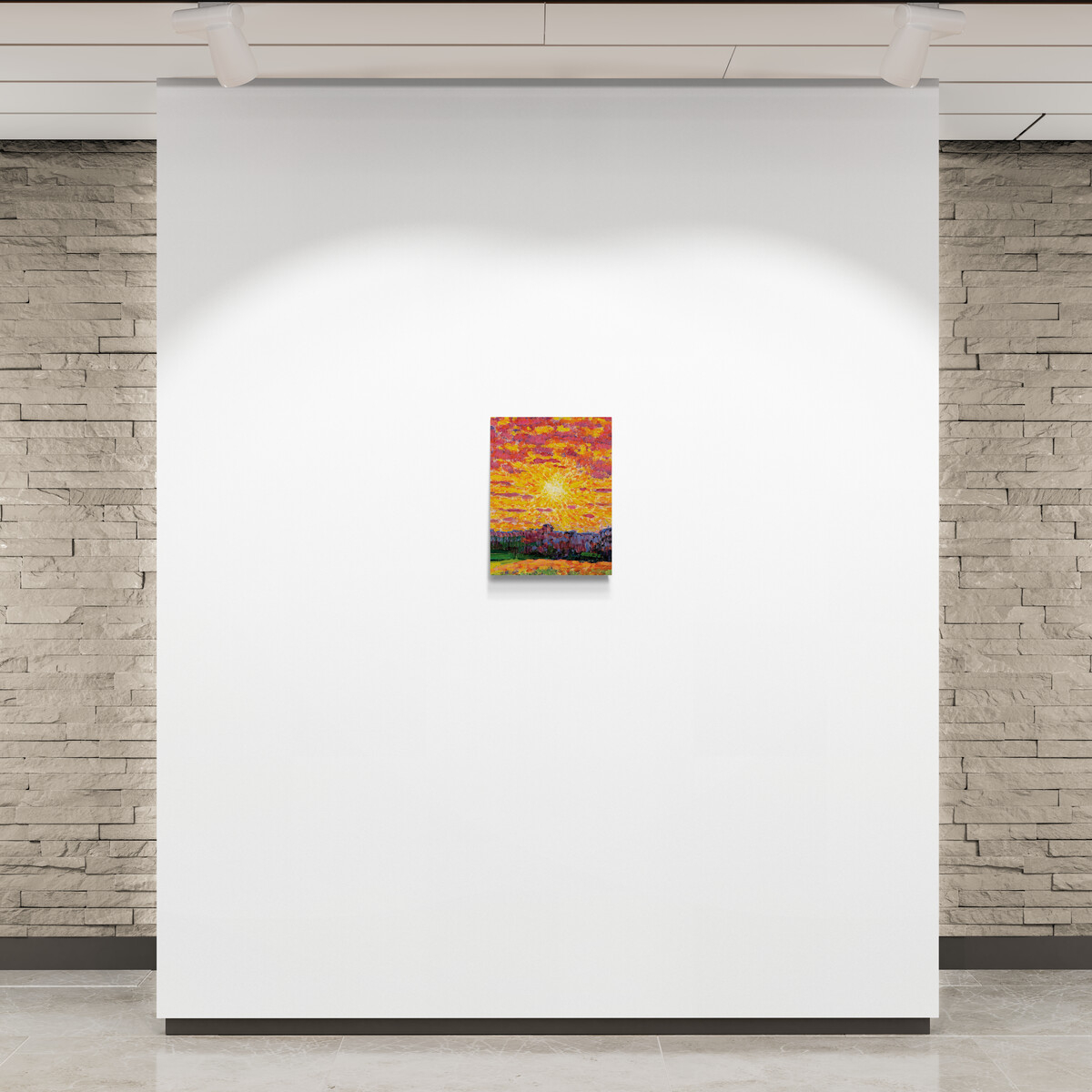 Mägi kasutab siin oma iseloomulikku julget värvikäsitlust, kus kuldkollased ja oranžid toonid kohtuvad sügavsinise taeva ja roheliste maapinna toonidega. Pintslitõmbed on ekspressiivsed ja sujuvad, andes edasi nii maastiku kui ka päikesevalguse voogamist. Maal suudab tabada hetke lummust, mil päike värvib kogu looduse soojade toonidega ja annab edasi tunnet, et loodus on elav ja hingav.