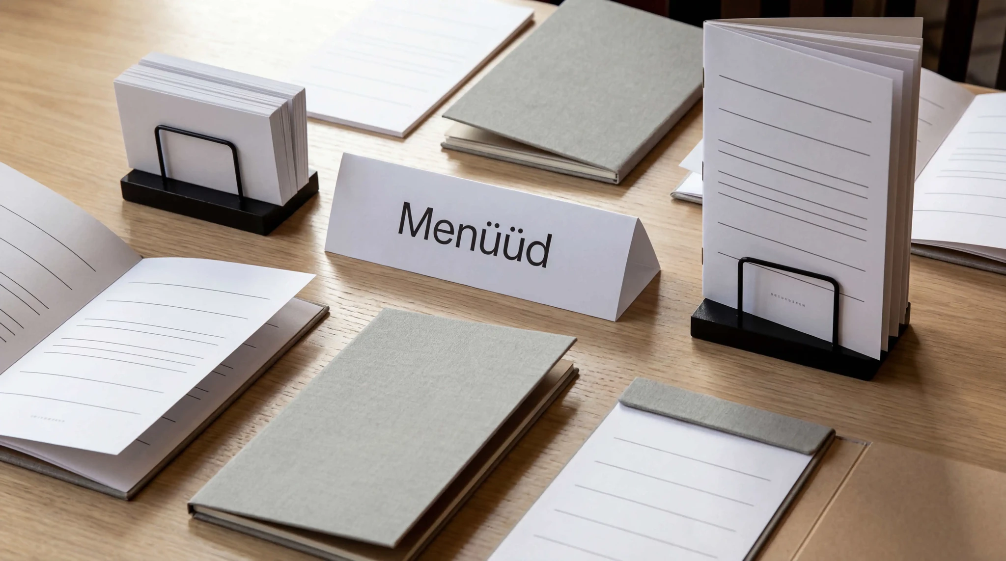 Restorani menüü, joogimenüü või barimenüü peab olema üles ehitatud nii, et külaline leiaks vajaliku info kiiresti. Kirjastiili valik, fondi suurus, värvide kontrast ja paigutus toetavad lihtsat orienteerumist – toitude ja jookide nimetused, kirjeldused, allergia- ja koostiseinfo ning hinnad on korraldatud loogiliste gruppide ja plokkidena. Kui ettevõttel on olemas brändiraamat või varasem menüüde stiil, lähtume sellest; kui mitte, aitame luua ühtse visuaalse keele, mis sobitub interjööri ja üldise kuvandiga. Enne trükki korrastame ja kontrollime menüüfaile nii, et need vastaksid trükitehnoloogilistele nõuetele ja oleksid igas formaadis ühtlaselt korrektsed.